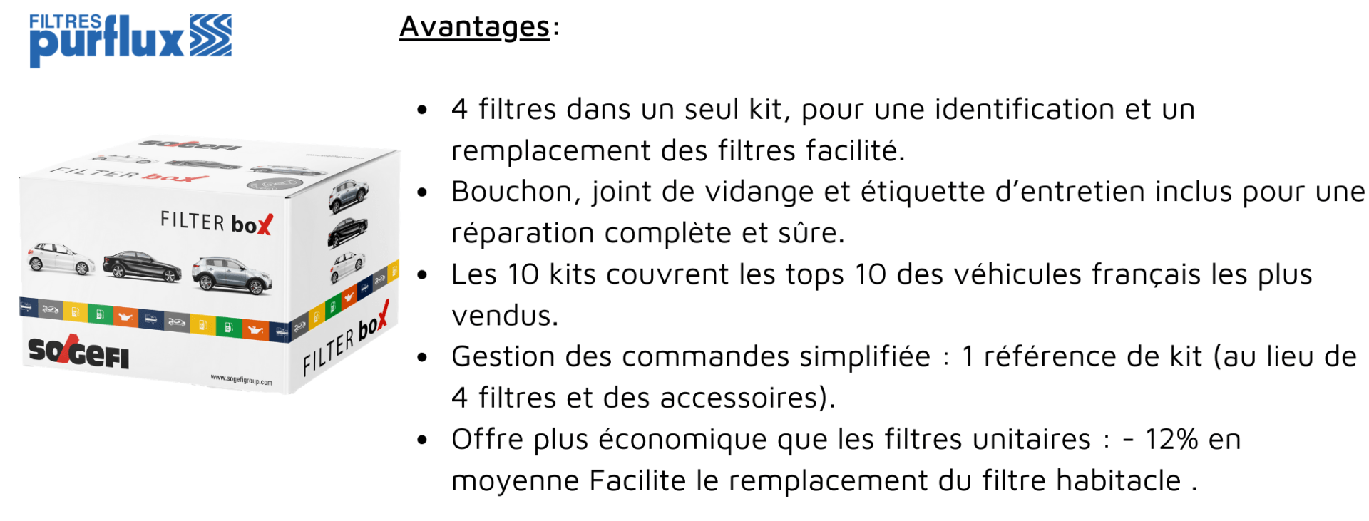 This “All in one” offer includes the 4 filters: oil, fuel, engine air and passenger compartment as well as the gasket, the drain screw and the maintenance label. With a single order, the Filter Box saves time and makes maintenance safer. The Filter Box also encourages the replacement of the cabin air filter, too often forgotten, even though it constitutes an element of protection for the health and safety of the driver and passengers.